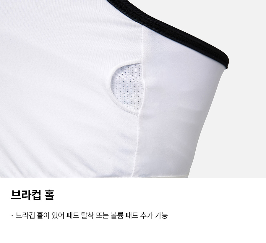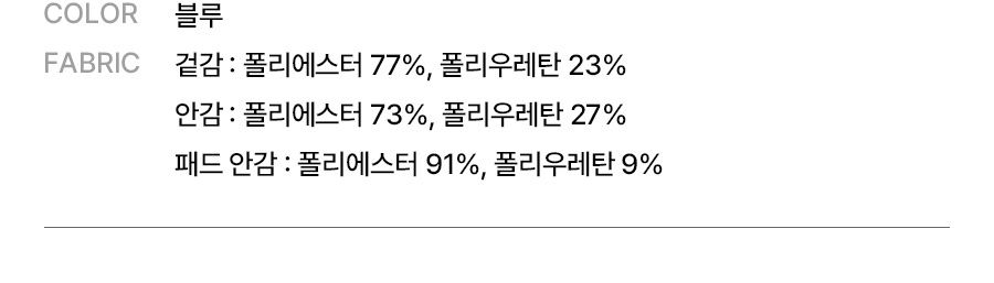겉감: 폴리에스터 77%, 폴리우레탄 23% / 안감: 폴리에스터 73%, 폴리우레탄 27% / 패드 안감: 폴리에스터 91%, 폴리우레탄 9%