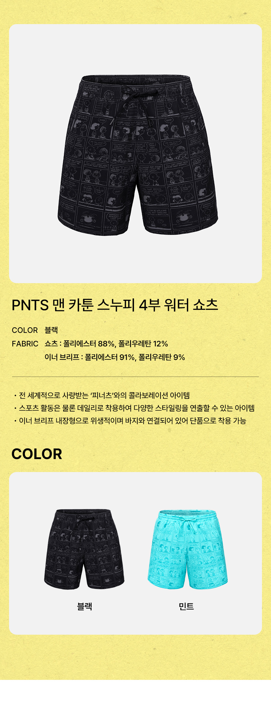 쇼츠: 폴리에스터 88%, 폴리우레탄 12% / 이너 브리프: 폴리에스터 91%, 폴리우레탄 9%