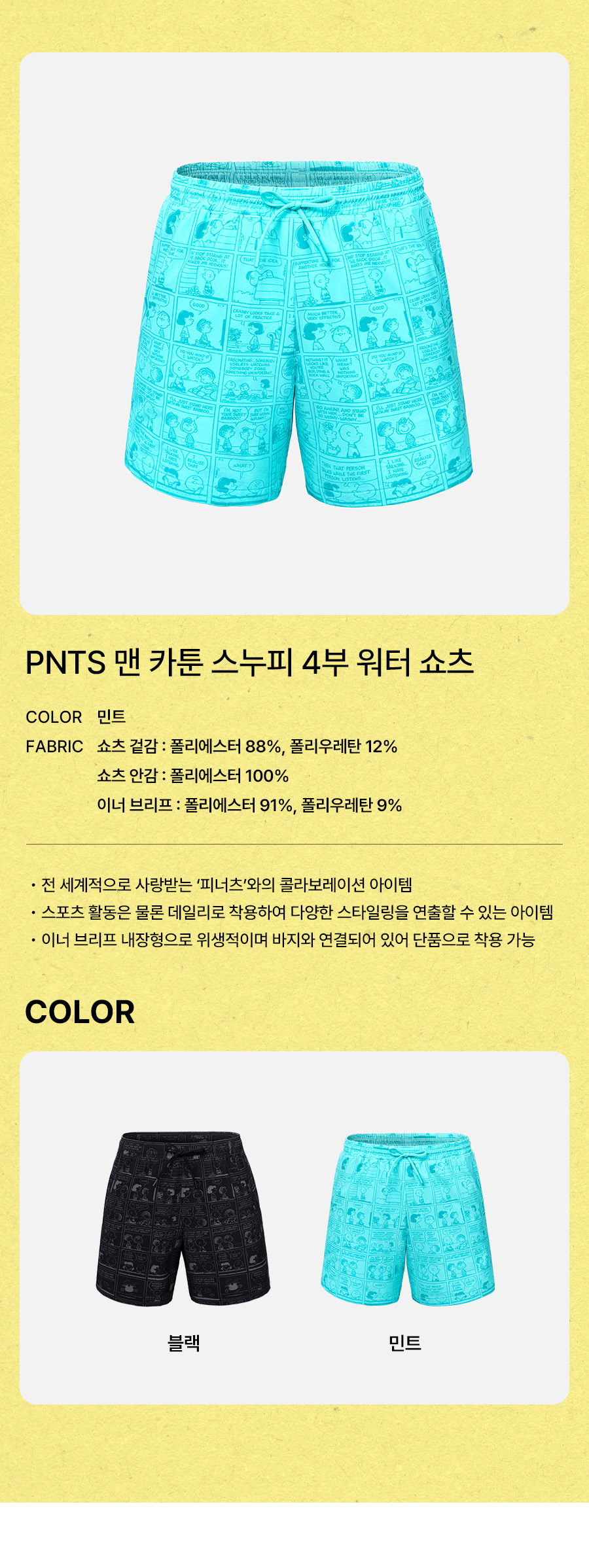 쇼츠 겉감: 폴리에스터 88%, 폴리우레탄 12% / 쇼츠 안감: 폴리에스터 100% / 이너 브리프: 폴리에스터 91%, 폴리우레탄 9%