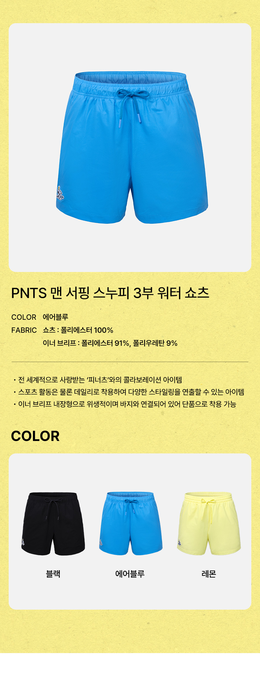 쇼츠: 폴리에스터 100% / 이너 브리프: 폴리에스터 91%, 폴리우레탄 9%