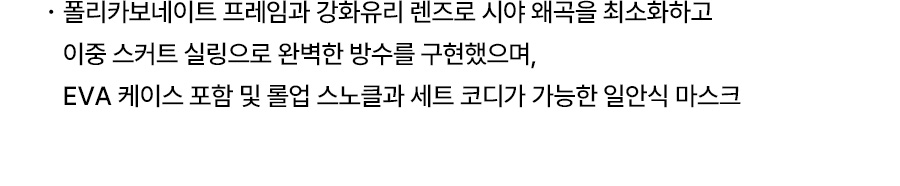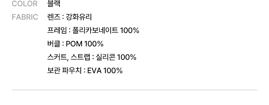 렌즈: 강화유리, 프레임: 폴리카보네이트 100% / 버클: POM 100% / 스커트,스트랩: 실리콘 100% / 보관 파우치: EVA 100%