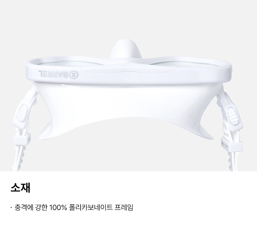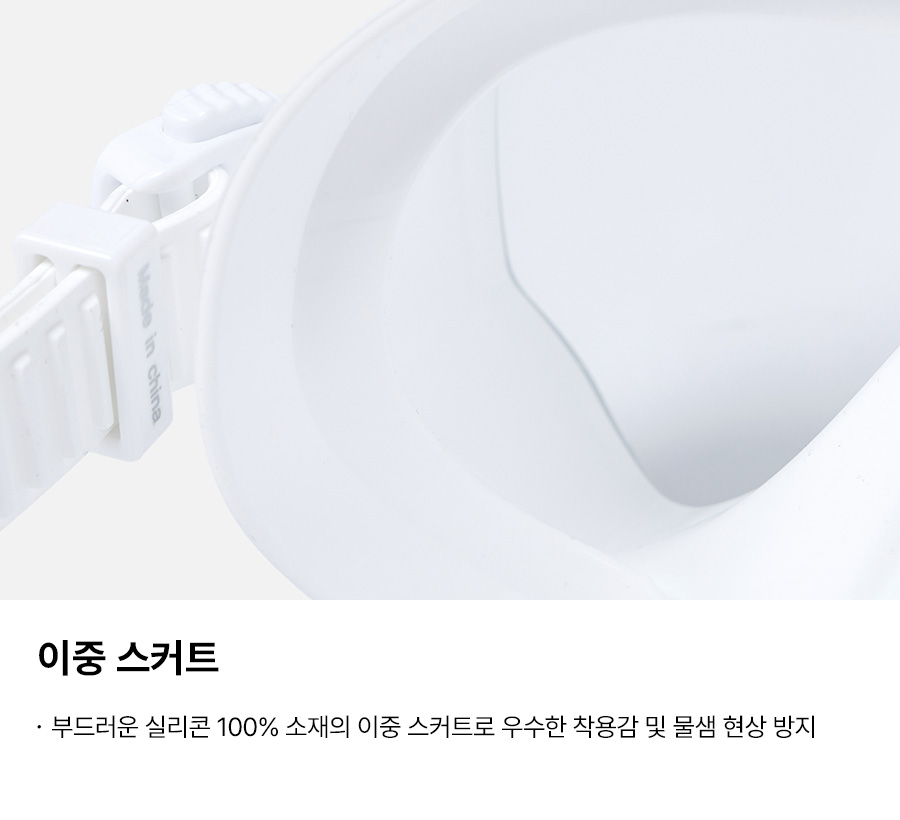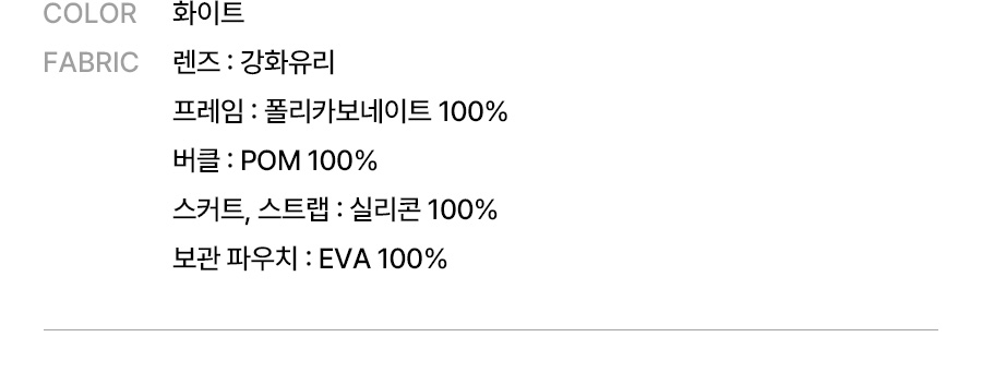 렌즈: 강화유리, 프레임: 폴리카보네이트 100% / 버클: POM 100% / 스커트,스트랩: 실리콘 100% / 보관 파우치: EVA 100%